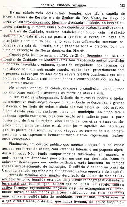 | Transcrição da Revista do Archivo Público Mineiro, editada em ouro Preto, então capital de Minas, em 1897. O conteúdo, doze anos antes, em 1885, saiu no primeiro jornal de Montes Claros, “Correio do Norte”, fundado e editado pelo autor – o depois desembargador Antônio Augusto Veloso, pai da imprensa de Montes Claros. É o mais antigo documento sobre a história de Montes Claros - Parte 1 A mais antiga notícia em formato acadêmico que se tem de Montes Claros foi divulgada na capital Ouro Preto pela Revista do Archivo Público Mineiro, em outubro e dezembro de 1897. Doze anos antes, havia sido publicada em M. Claros, pelo jornal Correio do Norte, "de propriedade do autor". É um documento raro hoje em dia, saído da pena do depois desembargador Dr. Antônio Augusto Veloso, reconhecido e homenageado como o pai da imprensa de Montes Claros. Recebeu o nome de "Chorographia Mineira - O Município de Montes Claros". A remota publicação do Archivo Público diz, na apresentação, sob a "direcção e redacção de José Pedro Xavier da Veiga, diretor do mesmo Archivo": "Devemos esta excellente monographia, primorosamente elaborada, ao nosso distincto conterrâneo Sr. Dr. Antonio Augusto Velloso, cujos talentos e ilustração se têm revelado assaz em outros trabalhos não menos importantes, além dos que legamente desepenha como magistrado, sendo neste caracter um dos ornamentos de sua illustre classe no Estado e da República. É mais um valioso serviço que ao Archivo Público Mineiro presta desinteressada e patrioticamente o Sr. Dr. Antônio Augusto Velloso". É com este mesmo espírito que o montesclaros.com passa a reproduzir, a partir de hoje, em versão eletrônica na forma de folhetim, esta primeira e benemérita notícia da história de Montes Claros, acreditando que suscitar o registro dos passos inaugurais da civilização que aqui surgiu contribuirá, e muito, para entender e comprender a formulação do "ajuntamento novo" que avança pelo tempo. É, ainda, canhestra homenagem ao autor e sua descendência, pelo pioneiro serviço que prestou às gerações seguintes, ao iluminar os nossos primeiros passos. Que avançam para comemorar os iniciais 300 anos, talvez até completados, pois aqui se revela que os primeiros moradores chegaram por volta de 1707 às margens do hoje quase desaparecido rio Vieira. ![]() (Continuará, nos próximos dias, até a publicação de toda a "Chorografia") |